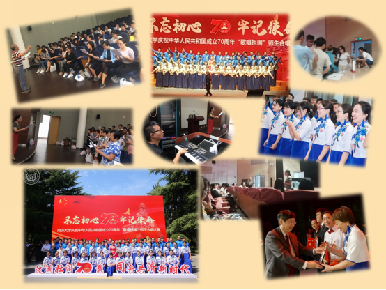暑假里,学院工会、宣传办和学工办三方配合,以王新页、刘琳和周龙三位老师为主导,开始筹备合唱工作。邀请合唱成员、聘请合唱指挥指导、选择歌曲、设计合唱内容、采买演出服,都在有条不紊地开展着。我院所选曲目《祝福祖国》,这本是一首由著名歌唱家汤灿演唱的独唱曲目,在暑假里,经过娄旻邦老师和杜一飞同学的反复推敲,改编成了一首富有深情的贺岁合唱。