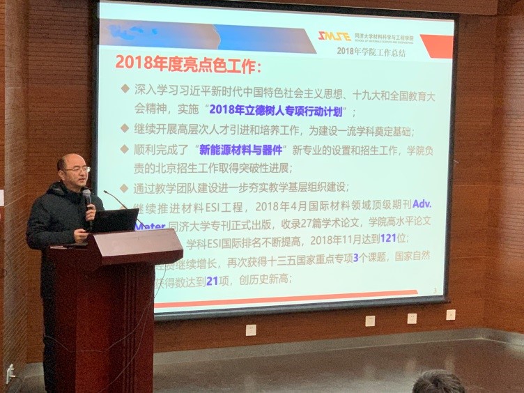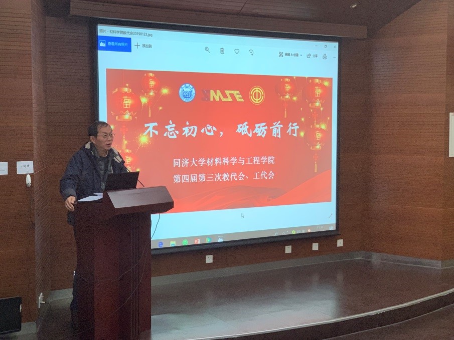 2019年1月23日,材料科学与工程学院以“不忘初心,砥砺前行”为主题在同济大学嘉定校区德才楼二楼报告厅召开了第四届教代会暨工代会第三次全体会议。材料学院学科主任黄云辉、党委书记王中平、党委副书记袁华、王凌凌,,学院教代会代表及列席代表共33人出席了会议。姚武、邱军副院长列席了会议.