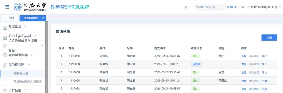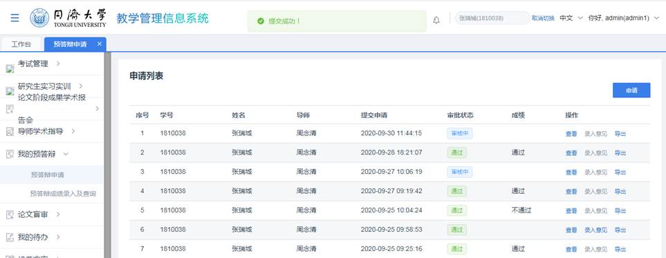 步骤 1 学生登录同济大学教学管理系统,进入“我的预答辩>预答辩申请”菜单;