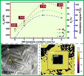 材料科学与工程学院翟继卫教授课题组长期致力于无铅压电材料的研究,近期该课题组与澳大利亚卧龙岗大学张树君教授合作,通过采用织构化工艺以及对铌酸钾钠(KNN)基压电陶瓷成分的设计和烧结工艺的优化制备出具有高织构度的KNN基压电陶瓷,其压电系数d33高达~700 pC/N,机电耦合系数kp为76%,电致应变量~0.3%,同时该材料具有高的居里温度和相对优异的电/热性能稳定性。该研究发现高的压电性能主要来源于三个方面:(Ⅰ)充分利用压电晶体的各向异性设计了具有<001>取向的正交(O)和菱方(R)相共存的晶体结构,该结构具有最合适的工程畴结构,即较多的能量等价的极化矢量(Ps)数以及极化矢量和外电场方向较小的夹角θ。(Ⅱ)织构陶瓷在外电压作用下产生的高的晶格畸变是压电性能提高的本征贡献。另外,极化过程中产生的新的中间相有利于极化过程的实现。(Ⅲ)TEM和PFM表征的结果发现织构陶瓷中由于模板晶粒的引入导致的电畴尺寸的减小(纳米畴)有利于畴壁在外电场作用下的移动。