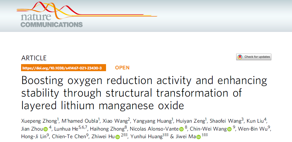 5月25日,我校材料科学与工程学院车用新能源研究院马吉伟教授、黄云辉教授团队在国际知名学术期刊《自然·通讯》(Nature Communications)上在线发表了题为“Boosting oxygen reduction activity and enhancing stability through structural transformation of layered lithium manganese oxide”的研究论文。该研究基于缺陷调控,利用质子交换的策略有序调控锰基材料的不稳定氧浓度和层间距,用于提升材料的催化活性和稳定性。该论文分别从材料的结构转变、电子特性和电化学性能等多个方面全面表征了调控前后锰基氧化物电催化剂的各项特征。研究发现了不稳定氧浓度和层间距对锰基材料催化稳定性和活性之间的关联性,同时该策略可以应用于其他含碱金属的层状金属氧化物材料,为构筑高性能氧还原反应非贵金属氧化物提供了新的设计思路。