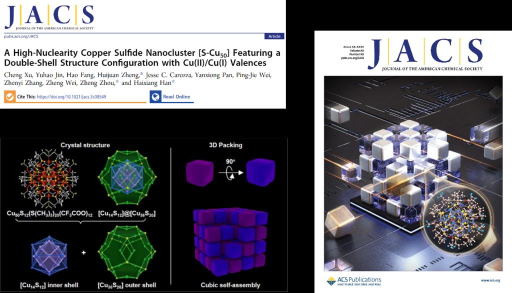 10月27日,《美国化学会志》(Journal of the American Chemical Society)在线发表了BB贝博艾弗森官方网站韩海祥团队的研究论文“A High-Nuclearity Copper Sulfide Nanocluster [S-Cu50] Featuring a Double-Shell Structure Configuration with Cu(II)/Cu(I) Valences,并被选为封面。