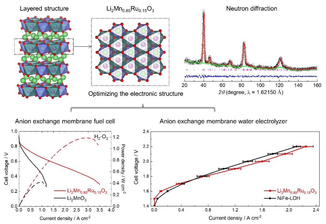 构筑低成本的催化剂替代铂催化剂,同时保持优异的电池性能,是目前学术界和产业界共同面临的难题,极具挑战性。基于此,马吉伟教授团队选择非铂金属氧化物催化剂开展研究。该团队以锰酸锂作为研究模型,开发了一种高稳定性、高活性的富锂锰基催化剂材料。通过在富锂锰基材料中引入4d过渡金属Ru取代3d过渡金属Mn,调节金属-氧共价性,从而提高材料的结构稳定性,并显著提升了其催化活性和稳定性。研究还利用原位X射线吸收谱对氧还原反应过程进行了详细解析,提供了Mn和Ru都是氧还原反应直接活性位点的原位谱学证据。此外,该富锂锰基催化剂展示出优异的燃料电池性能,峰值功率密度达到1.2 W cm-2,优于商业化Pt/C催化剂。在水电解槽中,该催化剂在电压为1.9 V时展现了1.2 A cm-2的电流密度,其性能超过了NiFe-LDH、RuO2和其他过渡金属氧化物。