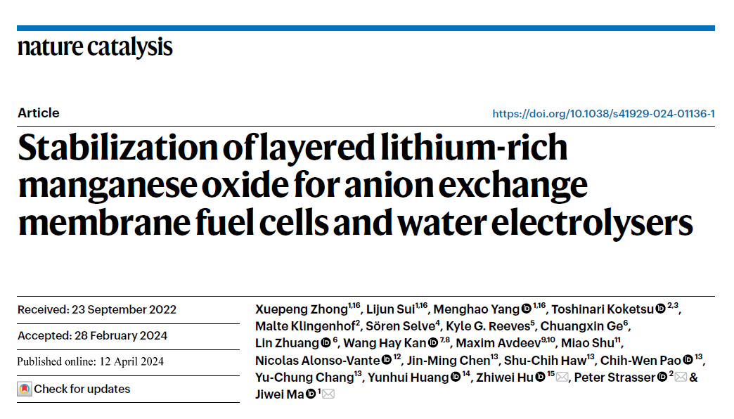 北京时间2024年4月12日17点,国际顶级期刊《自然·催化》(Nature Catalysis)在线发表了我院马吉伟教授团队的这一研究成果。论文题目为“Stabilization of layered lithium-rich manganese oxide for anion exchange membrane fuel cells and water electrolysers”。