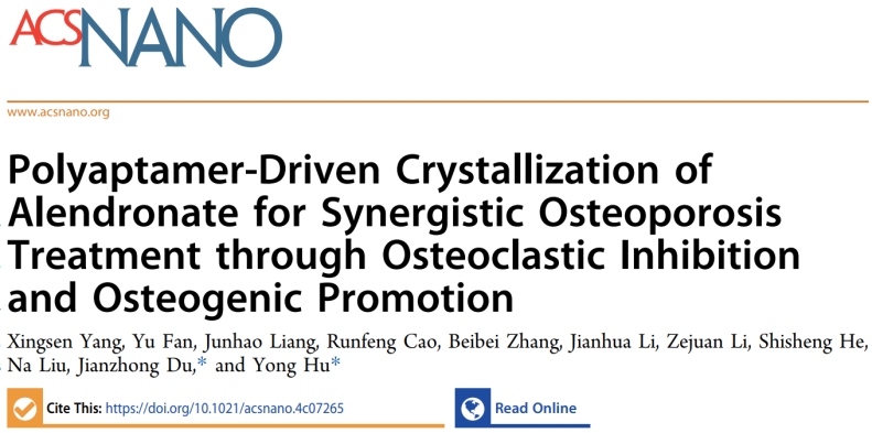 研究成果近期以“Polyaptamer-Driven Crystallization of Alendronate for Synergistic Osteoporosis Treatment through Osteoclastic Inhibition and Osteogenic Promotion” 为题发表在《美国化学学会纳米》(ACS Nano)。BB贝博艾弗森官方网站硕士生杨兴森为论文的第一作者。BB贝博艾弗森官方网站胡勇教授和杜建忠教授为论文的共同通讯作者。该研究得到了国家海外高层次青年人才计划、国家自然科学基金杰出青年科学基金等项目资助。