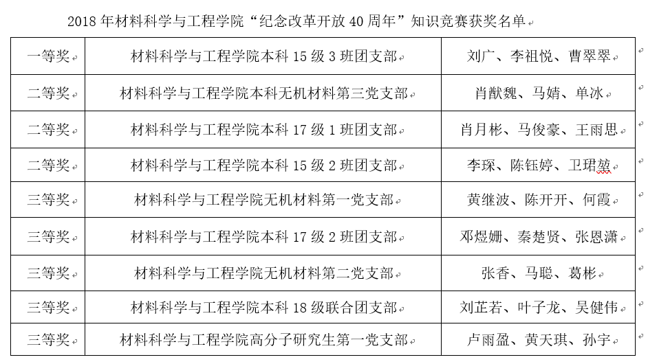 本次竞赛不仅使同学们学习了解了改革开放四十年以来国民经济、教育、文化、政府职能、党史等方面的基础知识和巨大改变,增强了民族认同感和自信心;同时激发了我院全体党员同志的爱国、爱党、爱材料的热情,提高了党性修养,也鼓励了同学们坚定信心、奋发进取,以良好的精神状态立足于自己的学习与工作,努力将材料的研究成果播撒在祖国大地上!