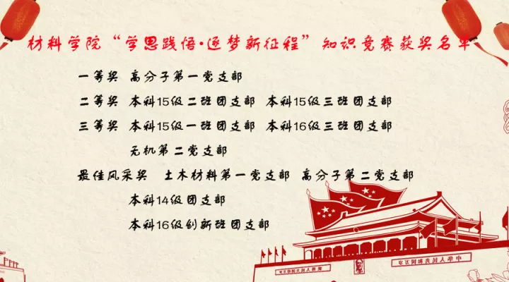 为深入学习领会党的十九大精神,激发广大学生党员及团员积极学习、深刻思考、踊跃讨论的热情,并以此带动身边同学广泛参与,材料学院党委组织学生党支部和团支部于11141330分在徳才馆2楼报告厅开展以“学思践悟•逐梦新征程”为主题的知识竞赛活动。