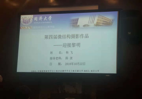 我校材料科学与工程学院与化学科学与工程学院的4幅作品在决赛中分别获得一等奖1项、二等奖3项,其中材料科学与工程学院2016级材料-汽车-新能源实验区的本科生孙一明凭借“PPV stm成像”作品(指导教师:许维)斩获技术创新组一等奖,材料科学与工程学院2016级博士生杨飞的作品“迎接黎明”(指导教师:陈波)荣膺技术创新组二等奖,材料科学与工程学院2015级博士生向震的作品“骑手”(指导教师:陆伟)和化学科学与工程学院2017级硕士生齐美园的作品“浪彩海洋”(指导教师:王启刚)获得艺术创新组二等奖。同济大学荣获本届微结构摄影大赛最佳团体奖。