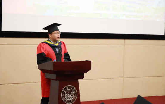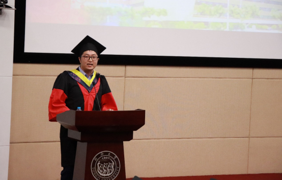 2018年上海市优秀毕业研究生、同济大学第十一届研究生“学术先锋”潘仲彬博士代表全体毕业生发言,他以人生选择和个人经历感慨学无止境,三载求学春秋,强大的信念支撑,一贯的坚持不懈,成就了自信满满、追求卓越的我们。他真挚感谢母校包容了我们的懵懂无知,孕育了我们的成熟睿智。大家相约,即便走得再远也要记得回来,特别为母校、材料学院的明天再留下一份情、一份心。无论何时何地,将同济人“同舟共济、自强不息”的精神发扬光大。