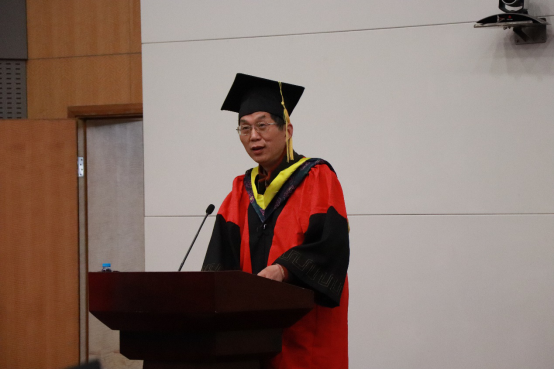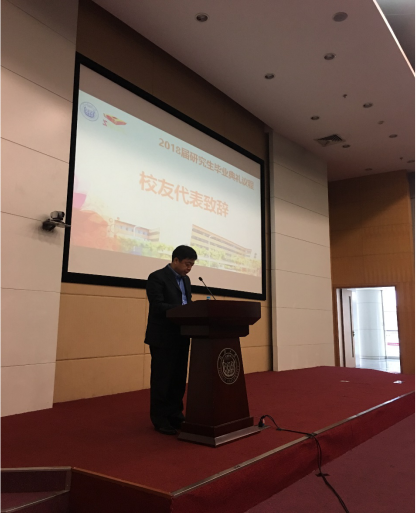 典礼在雄壮的国歌声中拉开序幕,典礼伊始,学院党委书记王中平致辞,他对全体毕业研究生致以热烈祝贺和美好祝福,欣慰于同学们寒窗十数载终有所得,欣喜于同学们成长为于国于家有望的人,王书记向提出了几点希冀,期待毕业生怀有坚韧不拔之志,对事有毅力,持之以恒,善假于物,以“德才馆”的名称诠释,告诫大家为人有信念,德才并举,厚积薄发,同时提醒同学们处群有态度,文墨诗书,饮流怀源,在未来平凡的生活中请不要忘记"诗与远方",不忘初心,砥砺前行。