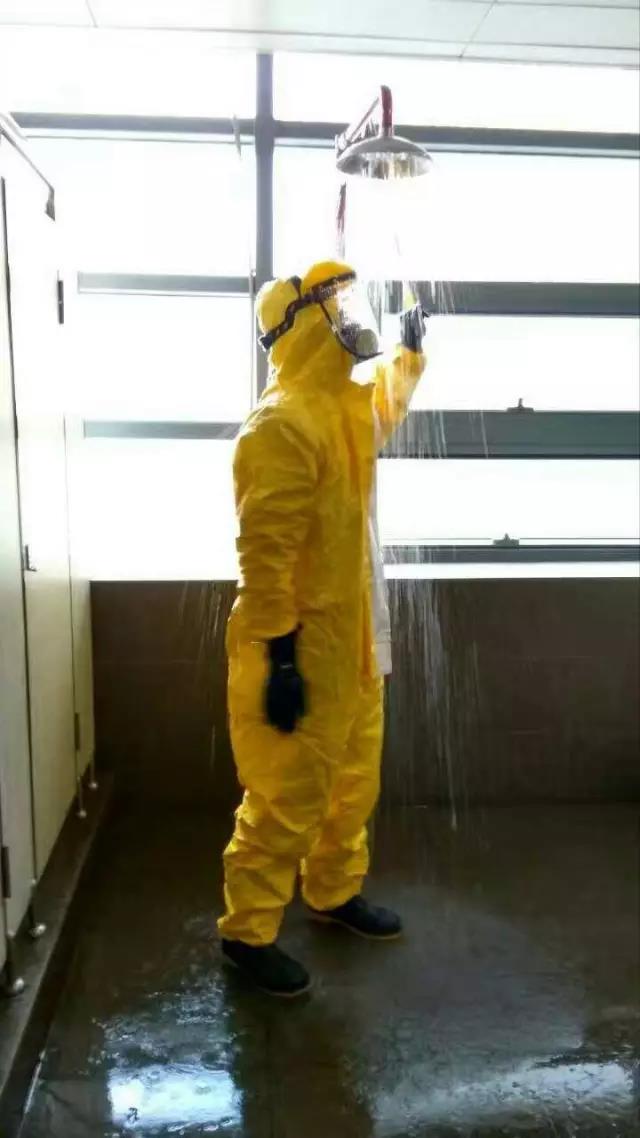 学院安全员立即安排了专业救护队员赶赴现场紧急处置了这一突发事件。依次对“浓硫酸”进行围堵、吸收、中和及处理完毕后处置人员的清洗工作。