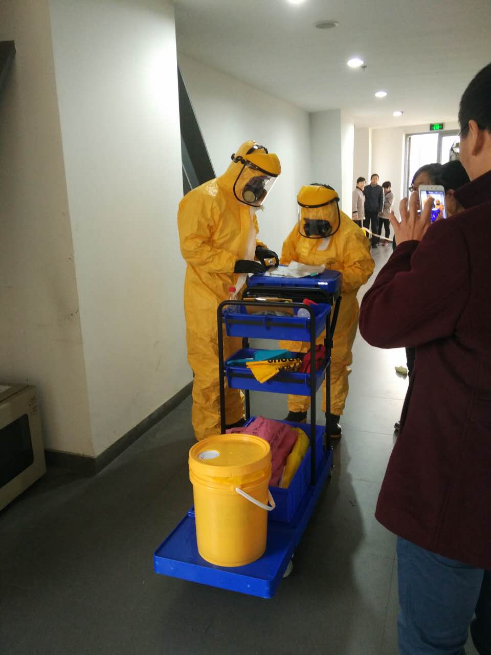 演练从下午14:30分左右开始,从德才馆422实验室里传出一声惊呼“不好啦,有浓硫酸瓶打破拉,请大家撤离现场。”