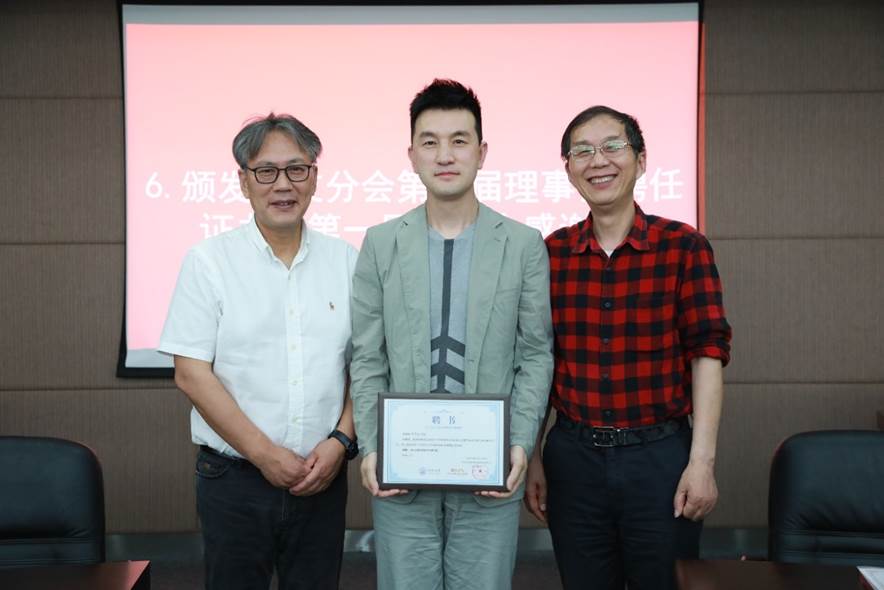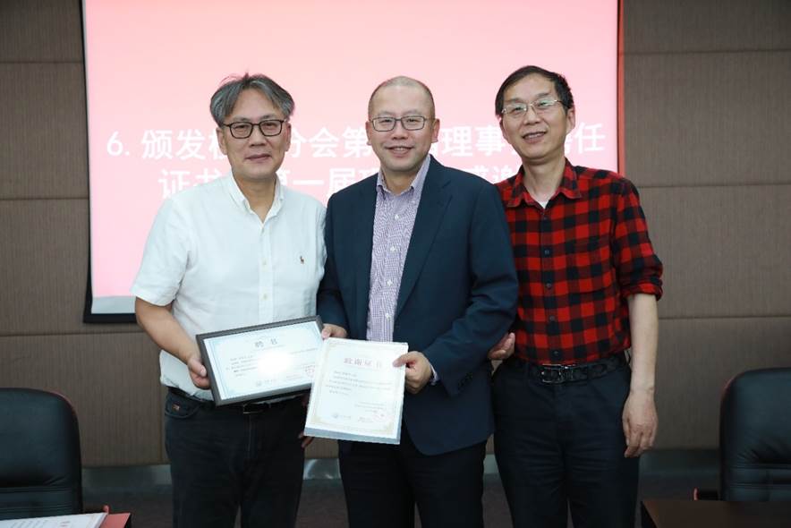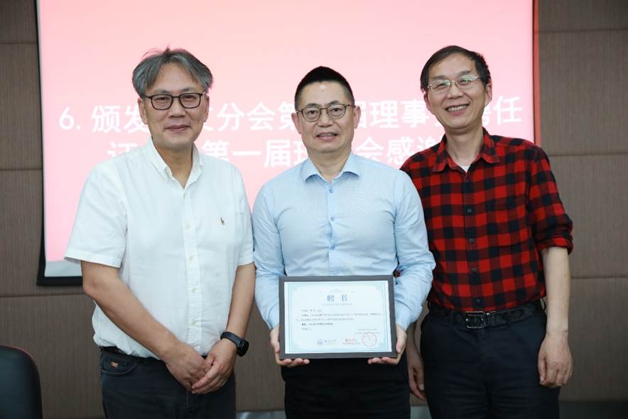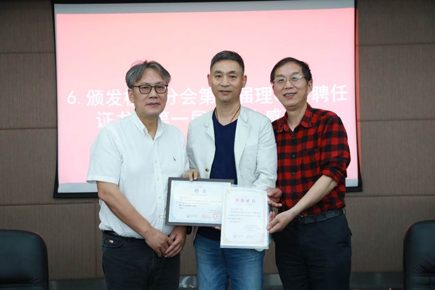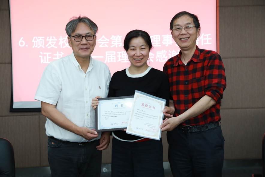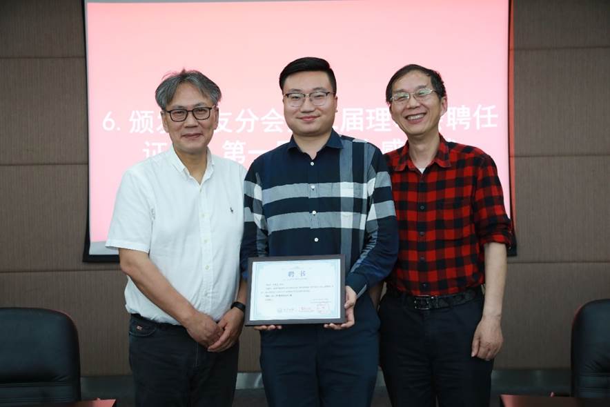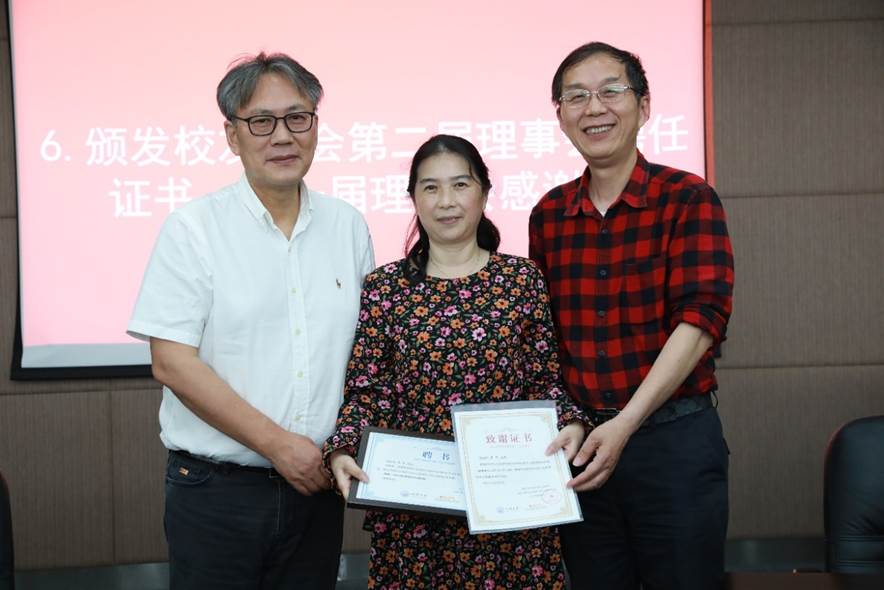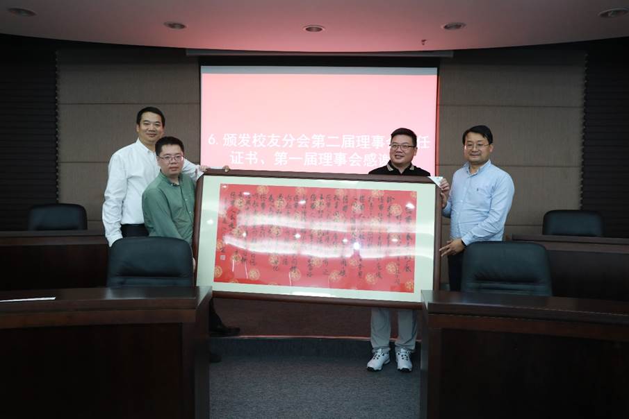 接着与会人员审议并鼓掌通过了校友分会第一届理事会工作报告,推荐选举了第二届理事、会长及执行会长。第二届理事会成员充分代表行业领域、地域范围、年龄结构等,在充分酝酿,广泛征求意见基础上推荐产生35位理事。王中平书记和李月中校友分别担任材料校友分会第二届理事会会长及执行会长,两名会长向各位信任理事颁发了聘任证书,同时也为第一届理事会成员颁发感谢状。校友分会第一届理事会执行会长,81级校友肖水龙借学院校友分会理事会换届、学科成立65周年之际,创作诗词一篇《您带人民走到底》,赞颂党的百岁华诞,特别制作书法墨宝献礼学院。93级校友侯俊琳向学院校友及师生代表赠送《从一到无穷大》书籍留念。