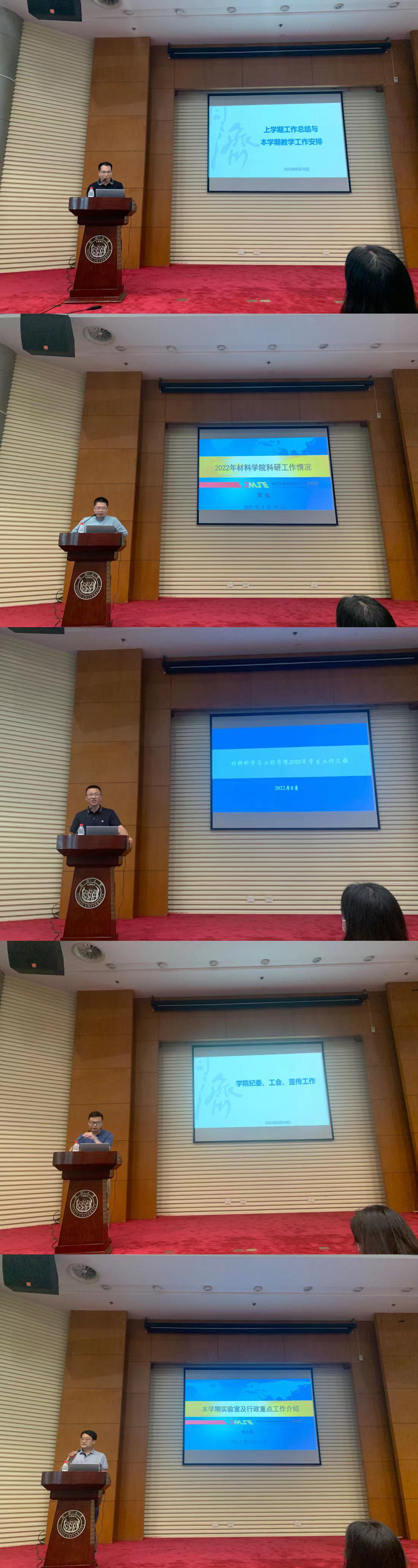 杨晓杰书记做了题为《凝聚共识,追求卓越,高质量育人服务中国式现代化》的主题报告。首先,杨书记传达了中层干部综合治理能力提升专题研讨班主要精神。8月18日-21日,同济大学中层干部综合治理能力提升专题研讨班(第三期)开班。本期研讨班以 “落实立德树人根本任务,全面提升人才培养质量”为主题,是学校去年广泛深入开展的“教育思想大讨论”之后的再深化、再出发。旨在从问题导向出发,深入学习思考新时期党和国家对高校人才培养的新要求,凝聚共识,追求卓越,更好肩负起为党育人、为国育才的崇高使命。教育部高等教育司司长、同济大学兼职教授吴岩应邀来校作了题为《服务中国式现代化,建好金专、金课、金师、金教材》的主旨报告,他肯定了学校开展的教育思想大讨论。强调我们要把握战略主动,走好人才自主培养之路。指出,要从根本上建好金专,上好金课,锻造金师,写好金教材,建设质量文化,努力练好大学的五大内功。校长陈杰在题为《遵循规律、精准识变、科学应变、主动谋变,一流大学高质量人才培养工作的思考》的开班报告中,从六个视角阐述当前学校人才培养面临的新形势、新使命和新要求,围绕学校在人才培养五个重要环节中存在的问题进行了深入的分析,并对后续工作提出了明确的路径。方守恩书记在总结报告中强调,立德树人是高校的根本任务,一流大学要有一流的育人体系,培养一流的创新人才,为全面建成社会主义现代化强国、实现中华民族伟大复兴中国梦提供源源不断的高质量人才支撑。杨书记对学院人才培养工作做了介绍。其次,对学院2022年上半年工作进行小结,指出在这次战疫中,学院一手抓防疫,一手抓发展,各项工作取得了成效。无论是校区防疫管理还是教学和实验室保障,无论是科研攻关还是社区服务,都体现了同济材料人,凝“材”聚力,共克时艰,让“同舟共济”的同济精神熠熠生辉。最后,对下半年工作计划进行布置,下半年我们的工作重点为优化顶层设计、推动依法治院、建设人才队伍和加强决策咨询。