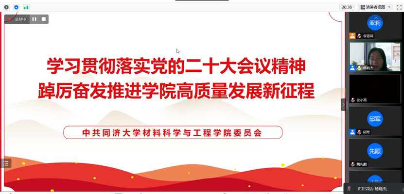 为深入学习贯彻党的二十大精神,增强“四个意识”、坚定“四个自信”、做到“两个维护”,杨晓杰书记以《学习贯彻落实党的二十大精神 踔厉奋发推进学院高质量发展新征程》为题,向与会人员传达了中国共产党第二十次全国代表大会精神,对全院深入学习贯彻党的二十大精神做出全面动员部署。同时,着重就实施科教兴国战略,强化现代化建设人才支撑进行介绍。她强调,党的二十大是在全党全国各族人民迈上全面建设社会主义现代化国家新征程、向第二个百年奋斗目标进军的关键时刻召开的一次十分重要的大会,对于团结和激励各族人民为夺取中国特色社会主义新胜利而奋斗具有重大意义。同时,她指出,要牢牢把握过去五年工作和新时代十年伟大变革的重大意义,坚持党的全面领导,把党中央的部署落实到人才培养和科学研究等各环节中,立足本职工作,踔厉奋发、勇毅前行,奋力书写学院高质量发展的新答卷。最后,通过回顾学院发展历史,面向2035的新材料强国战略研究的时代背景下,勉励全院师生共同努力,以饱满的热情和务实的态度推动材料学院高质量发展。