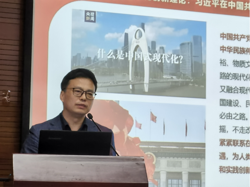 学院党委副书记、纪委书记邱军领学深入理解中国式现代化创新理论。邱军副书记强调:全院师生要深刻把握中国式现代化的中国特色、本质要求、重大原则,以及推进中国式现代化需要处理好的若干重大关系,深刻领悟“两个确立”的决定性意义,增强“四个意识”、坚定“四个自信”、做到“两个维护”,始终在思想上政治上行动上同以习近平同志为核心的党中央保持高度一致。