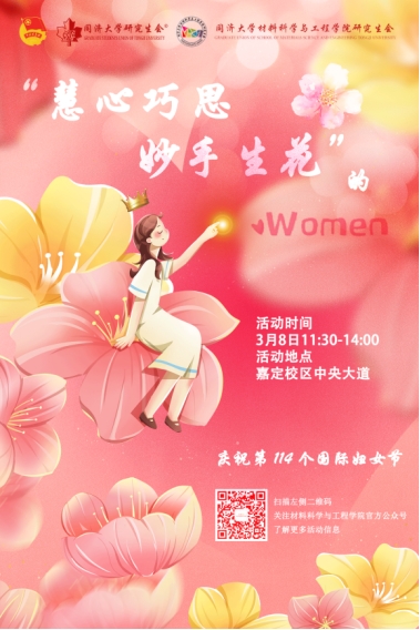 2024年3月8日,由同济大学研究生会和材料科学与工程学院研究生会联合举办的“慧心巧思,妙手生花”的WoMen——3.8国际妇女节线下主题活动在嘉定校区中央大道顺利举办。