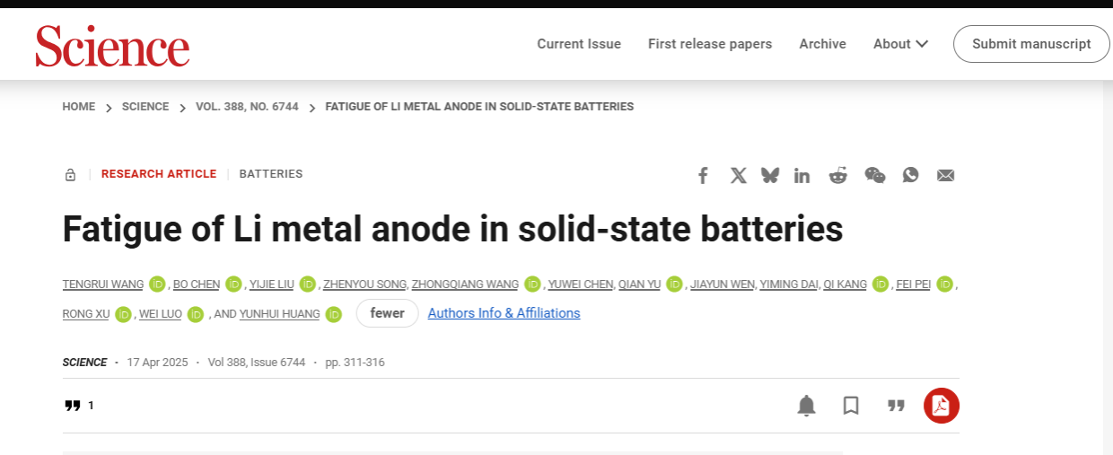 固态锂电池为何失效?BB贝博艾弗森官方网站研究团队给出了新机制。北京时间4月18日凌晨,《科学》(Science)在线发表了我院罗巍教授与合作者题为“Fatigue of Li metal anode in solid-state batteries”(固态电池锂金属负极的疲劳)的研究论文。该研究首次发现了固态锂电池金属锂负极疲劳失效现象,揭示了疲劳失效新机制,并提出了抑制疲劳失效改善固态电池性能的新策略。