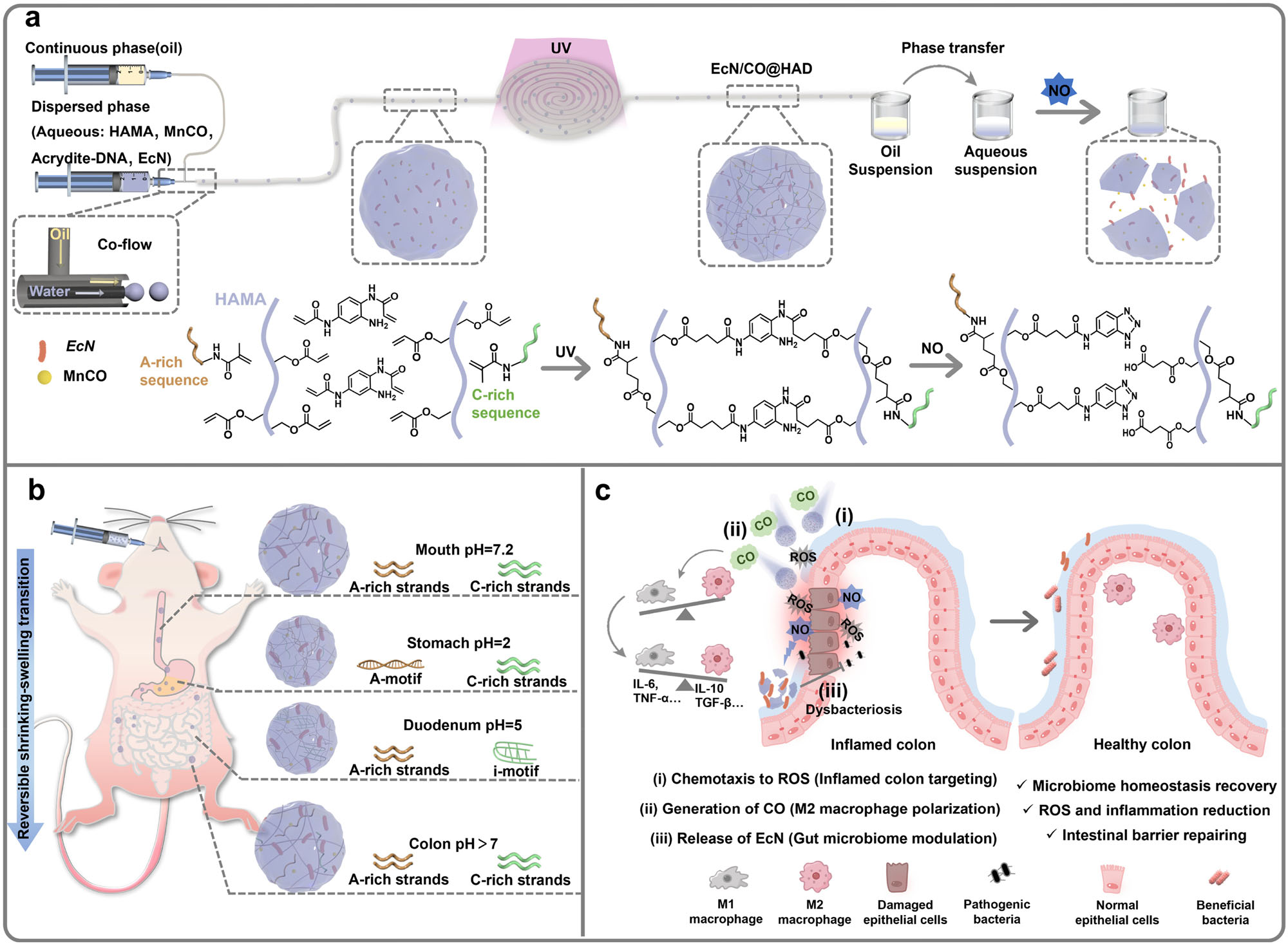 为此,我院胡勇教授课题组设计一种具有酸适应和炎症趋化能力的DNA微胶囊马达益生菌递送体系。该研究团队采用液滴微流控技术制备尺寸均一且单分散的油包水微液滴,并在该液滴水相中引发丙烯酸酯改性的寡核苷酸序列交联形成微胶囊。经口服后,当微胶囊到达胃部和十二指肠时,寡核苷酸序列组装成A-motif和i-motif结构,进而提高微胶囊分子网络的交联度,以抵御H+离子体对益生菌的侵袭。当微胶囊抵达结肠后,寡核苷酸二级结构解组装为单链分子,使其交联度降低至初始水平。