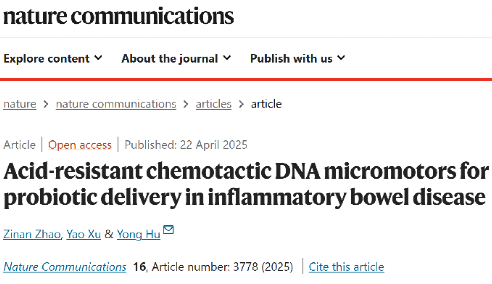4月22日,BB贝博艾弗森官方网站胡勇教授团队在《自然·通讯》(Nature Communications)上在线发表了题为“Acid-resistant chemotactic DNA micromotors for probiotic delivery in inflammatory bowel disease”的研究论文。