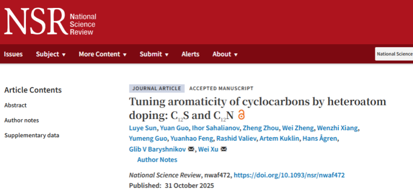 10月31日,《国家科学评论》(National Science Review)在线发表了BB贝博艾弗森官方网站许维教授团队与瑞典林雪平大学、芬兰赫尔辛基大学及瑞典乌普萨拉大学等国际合作团队的最新科研成果“Tuning aromaticity of cyclocarbons by heteroatom doping: C12S and C12N”。该研究利用扫描探针显微技术,成功合成了两种杂原子掺杂的环型碳:C12S(硫掺杂环型碳)和C12N(氮掺杂环型碳),并结合理论计算揭示了它们在芳香性上的根本差异。
