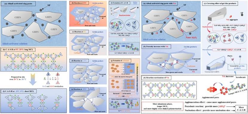 团队研究发现,温度降低显著削弱抗压强度,源于C-A-S-H生成量减少、缩聚度下降、孔结构劣化及碳化加剧。随着反应温度降低C-A-S-H缩聚度逐渐下降,而铝相在低温条件下更易融入链状结构。NA通过成核效应促进火山灰反应,从而加速C-A-S-H的缩聚过程,同时有效包裹原料颗粒并防止其进一步溶解(图3)。研究成果系统阐明了负温下AASP性能劣化机理与NA多尺度增强路径,构建了反应过程模型,为寒区低碳胶凝材料的工程应用提供了关键理论支撑与技术依据。