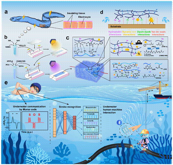 鉴于此,陈光同学受电鳗启发设计了一种疏水、绝缘弹性体封装导电水凝胶的结构方案,使用独特的封装工艺实现了原位聚合,制备了一款兼具优异的抗溶胀、自粘附和电稳定性的柔性传感器,并成功将其应用于泳姿识别、水下通讯和人机交互。