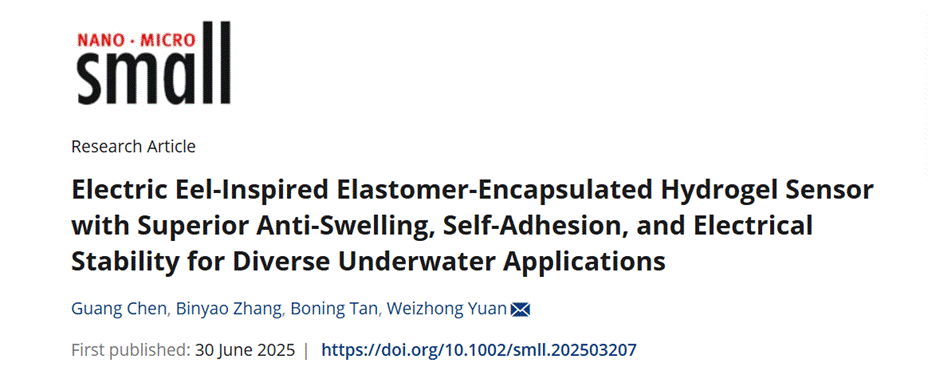 近期,我院2022级本科生陈光以第一作者身份在材料领域权威期刊《Small》上发表了题为Electric Eel-Inspired Elastomer-Encapsulated Hydrogel Sensor with Superior Anti-Swelling, Self-Adhesion, and Electrical Stability for Diverse Underwater Applications的研究论文,学院袁伟忠教授为该论文的通讯作者。