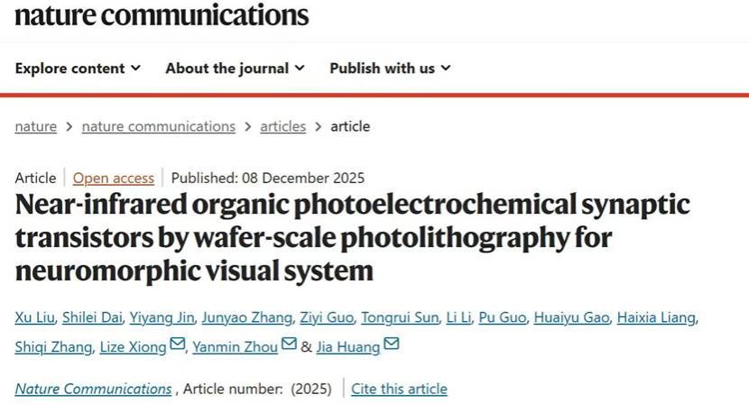 近日,我院黄佳教授团队在有机晶体管感知器件领域取得进展。12月8日,《自然•通讯》(Nature Communications)在线发表了该团队的一篇研究论文,题为“Near-infrared organic photoelectrochemical synaptic transistors by wafer-scale photolithography for neuromorphic visual system”。