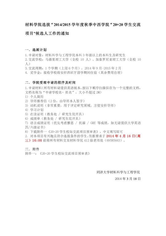 上一条:材料学院选拔“2014年马德里理工大学材料学优秀本科生国家交流项目”候选人工作的通知