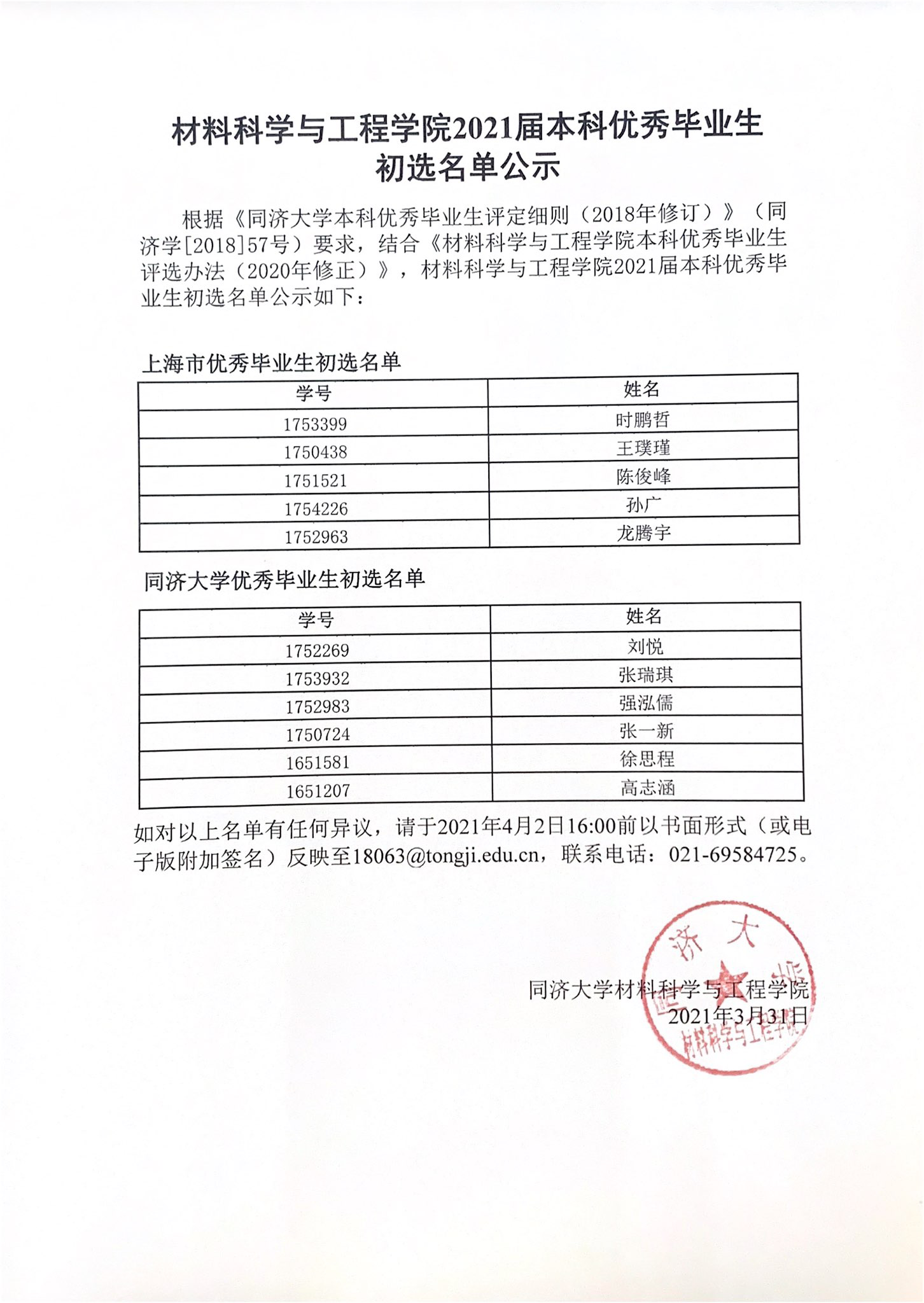 上一条:材料科学与工程学院2021届优秀毕业研究生初选名单公示