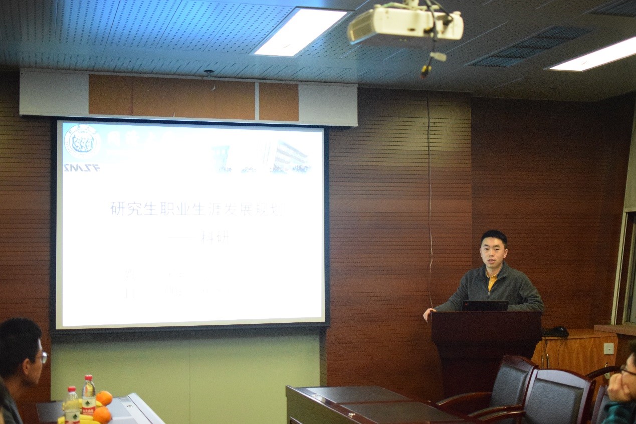 讲座的上半场由向震博士为同学们带来扎根于科研的研究生职业生涯发展规划,作为一名博士后,他首先向同学们分享了自己选择攻读博士的初衷。他说“攻博确实是一个非常艰苦与漫长的过程,但如果真心的热爱自己所从事的行业,读博仍然是最好的选择”。同时面对同学们所表达出来的对于攻博的疑惑与不安,他也打趣道:“确实,读博可能面对着很多很现实的问题,诸如家人甚至是另一半的压力,这就需要同志们拿出做学问养成的攻坚克难的信念和意志”。
