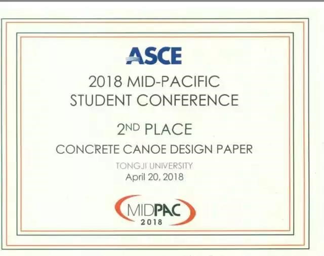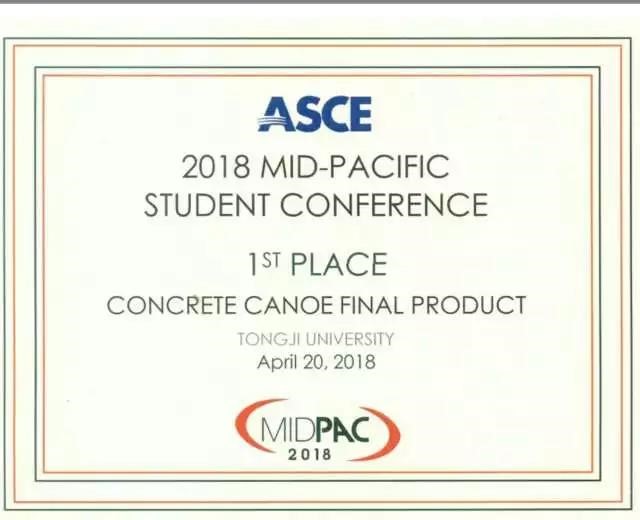 2018年4月19日至21日,在加州大学萨克拉门托分校举办的ASCE(美国土木工程师协会)土木工程大学生竞赛中太平洋分区赛(ASCE Student Conference Mid-Pacific Region)中,土木工程学院、材料科学与工程学院及设计创业学院等联合组成的同济大学混凝土轻舟队捍卫荣誉,蝉联轻舟项目总分冠军!