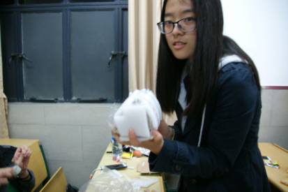 由于可利用的材料在数量和种类上都较为丰富,再加上同学们灵巧的设计,尽管工作人员将第一次鸡蛋下落的高度就设定为近两米半(人站在凳子上高举),所有的参赛组作品都成功通过了考验,一些同学意气风发之余甚至将鸡蛋高高抛起以示其牢固。
