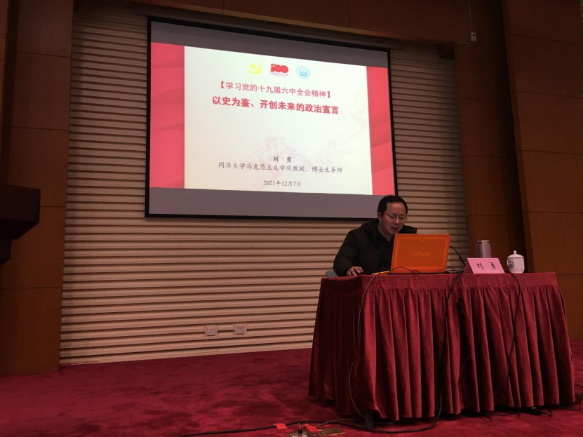 12月7日下午,同济大学马克思主义学院刘勇教授应邀在嘉定校区同心楼224宣讲十九届六中全会精神,本次政治理论学习由嘉定校区党工委主办,材料科学与工程学院和机械与能源工程学院承办,材料科学与工程学院领导班子及全体教职工130余人参加会议听取讲座。 刘勇教授以《以史为鉴、开创未来的政治宣言——学习党的十九届六中全会精神》为题作了精彩报告,从深刻认识党的十九届六中全会重大意义、深刻认识党的十九届六中全会重要成...