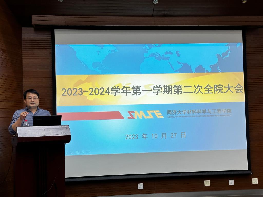 2023年10月27日下午,材料科学与工程学院2023-2024学年第一学期第二次全院大会在嘉定校区德才馆报告厅召开。会议由蒋正武副院长主持,全院100余名教职工参加了本次会议。会议伊始,学院党委书记杨晓杰代表学院领导班子,做硕博学位点专项核验及材料科学与工程专业工程教育认证工作动员讲话。随后,蒋正武副院长介绍了材料与化工专业硕博学位点专项核验工作及材料科学与工程专业工程教育认证专家线上考查工作的相关背景,并就上...